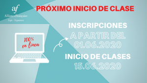 La Alianza Francesa de Loja iniciara su tercer ciclo pedagógico, en modalidad 100% en línea, el lunes 15 de junio de 2020. Las inscripciones iniciaran a partir del 1ro de junio. Para más información, por favor comunicarse a alianzafrancesaloja@gmail.com o por whatsapp al 095 912 7820.